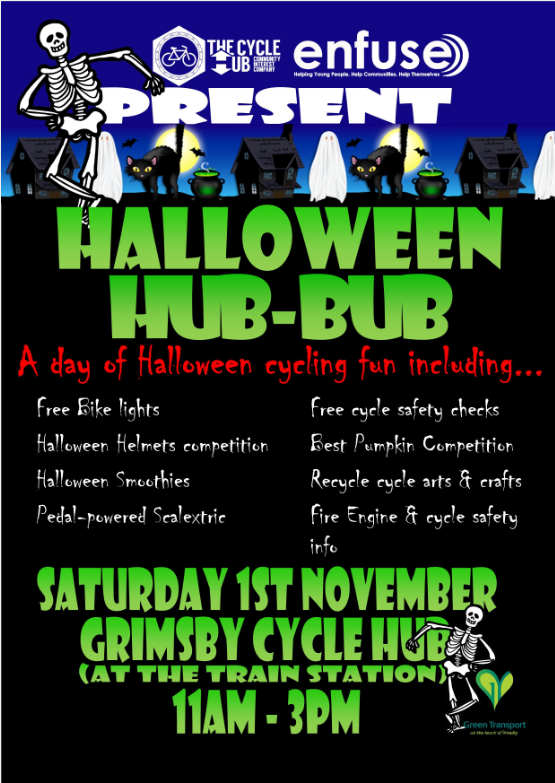 October 31, 2014 Halloween Hub-Bub at Cycle Hub 1st Nov Karl Elliott enfuse news, Events, Member News On Saturday 1st November, the Grimsby Cycle Hub (with support from our Enfuse team) are holding a “Halloween Hub-Bub”. Pop in between 11am and 3pm for a day of Halloween Cycling Fun.