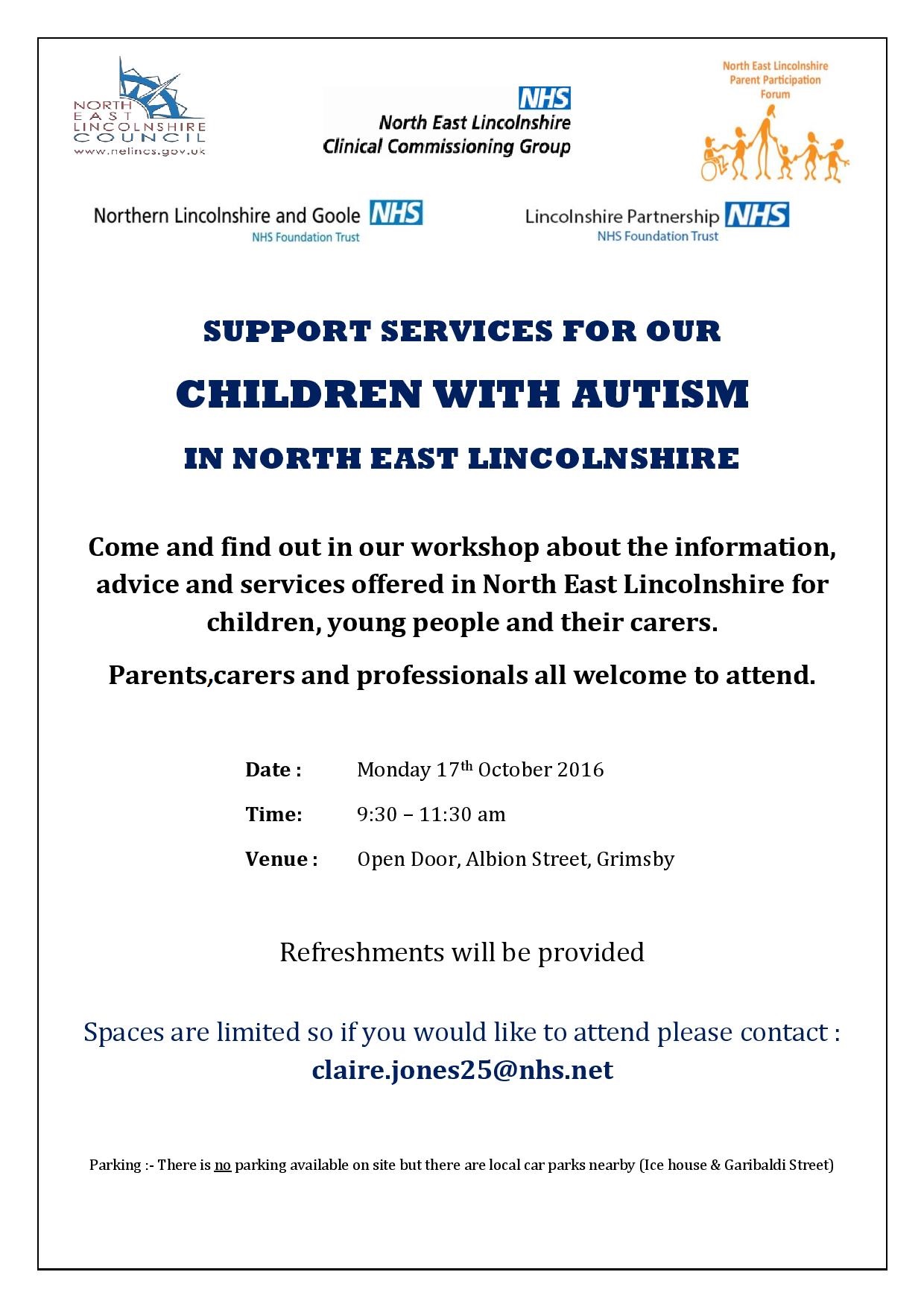 Do you want to find out more about local support services for children with autism? Or do you know someone who would be interested? Then come along to a workshop being held on Monday 17th October at Open Door, Albion Street, Grimsby.