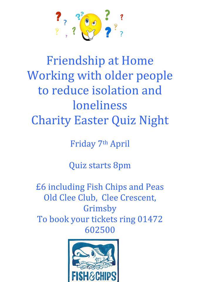 Friendship at Home are holding a Charity Easter Quiz night on 7th April at Old Clee Club, Clee Crescent, Grimsby from 8pm. Entry to the quiz night is £6 and will include a meal of Fish, Chips and Peas. The event will also include a raffle. If anyone could help provide prizes for the raffle, please contact FAH using the details below. All proceeds raised from this event will be used to fund the various projects FAH run to help older people in NEL throughout the year.