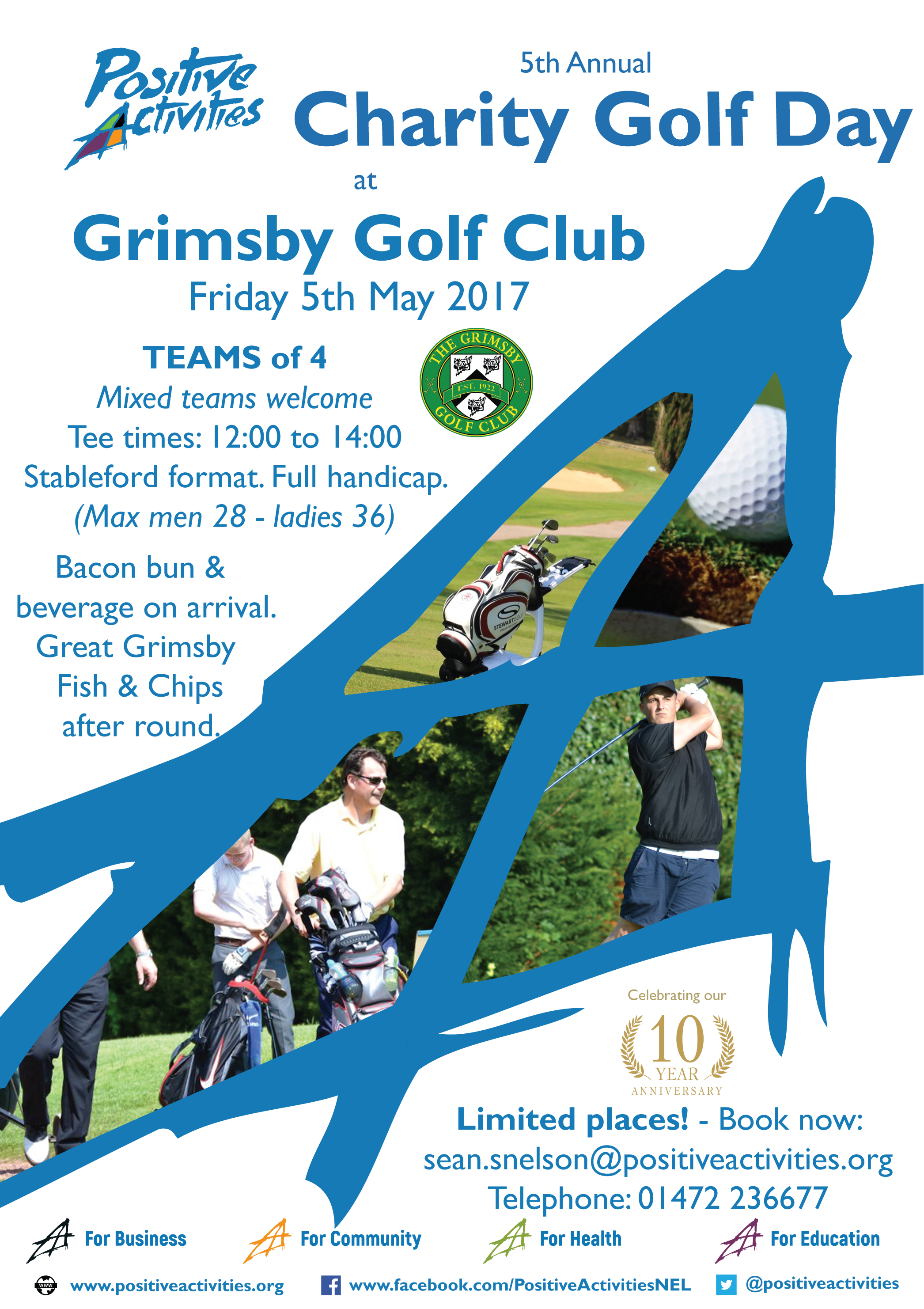 As part of their 10th Birthday celebrations, Positive Activities is holding their 5th Annual Charity Golf Day on Friday 5th May 2017 at Grimsby Golf Club with tee off times being available between 12 noon to 2pm. Organisers are looking forward to hosting another successful day on one of the region’s premier courses and are certain that with the help and support of local companies and individuals, they can continue to help those who most need it.