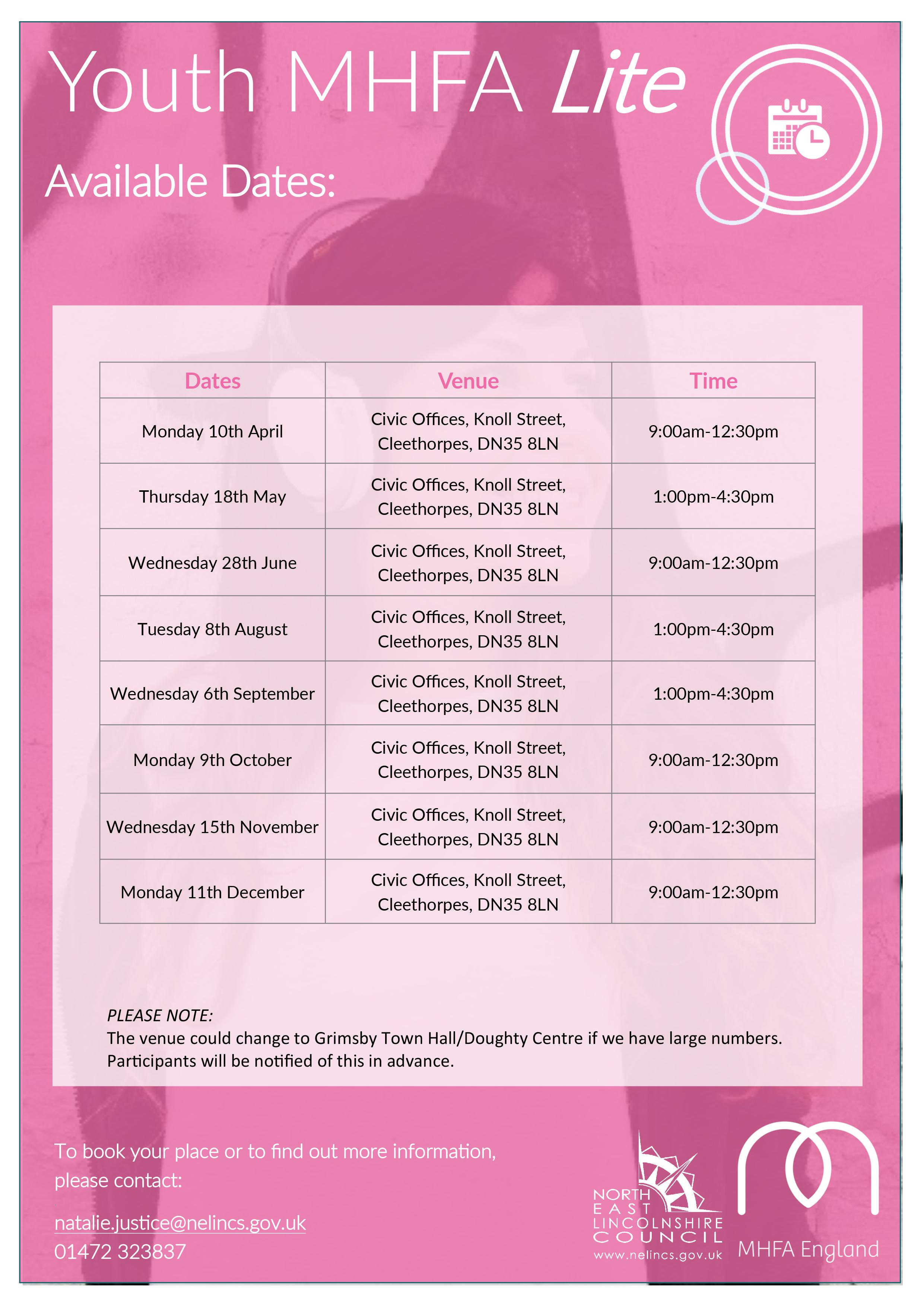 Youth Mental Health First Aid (MHFA) Lite upcoming training date. Thursday 18th May, 1:00 pm – 4:30 pm at the Civic Offices, Cleethorpes. The training is £40 per person. Subsidised places are available for people who work with children and young people.