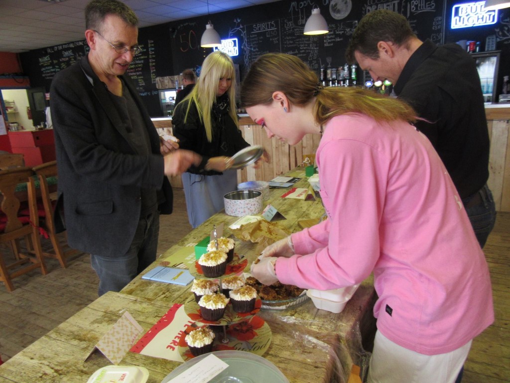 With 6 cakes and sweets entered into the bake off and a meal for 2 at Moon on the Water up for grabs, some serious cake tasting began. To judge the competition, members of the public were asked to make a donation where upon they then received a button so that they could cast their votes.