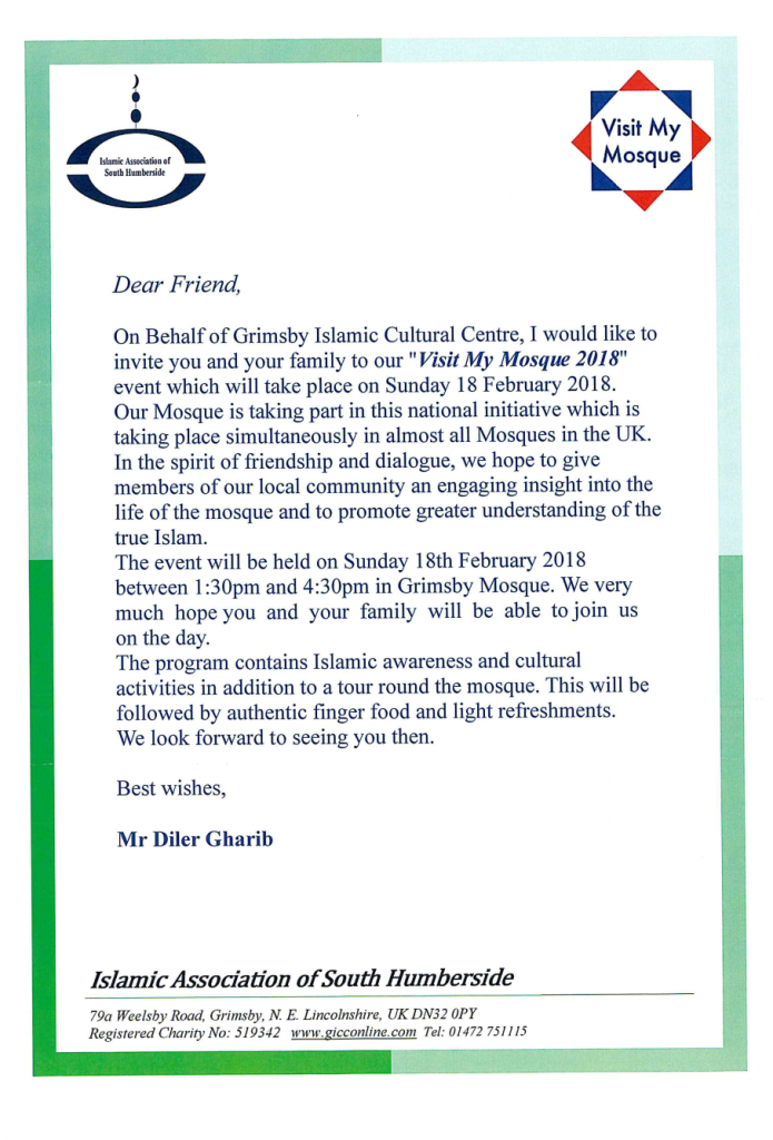The mosque in Grimsby will be open between 1.30 and 4.30pm and you are invited to attend.