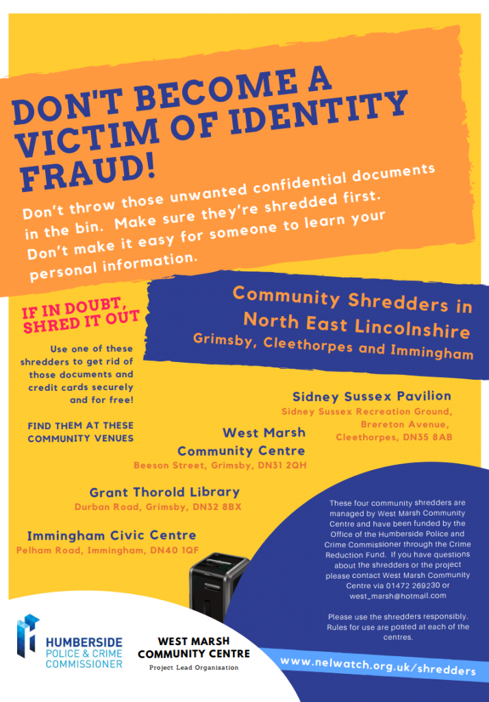 A project led by West Marsh Community Centre and funded by the Crime Reduction Fund has put four shredders out in the community (Grimsby, Cleethorpes and Immingham).